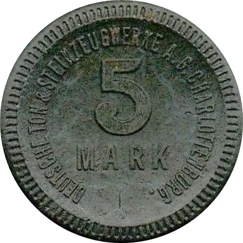 | Obverse lettering | Deutsche Ton & Steinzeugwerke A. G. Charlottenburg 5 Mark |
