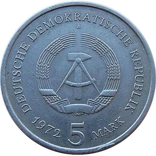 | Obverse lettering | DEUTSCHE DEMOKRATISCHE REPUBLIK A 1972 5 MARK (Translation: German Democratic Republic A 1972 5 Mark) |