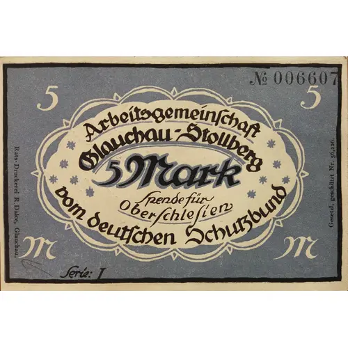 | Obverse lettering | 5 M 5M No. 006607 Arbeitsgemeinschaft Glauchau-Stollberg 5 Mark Spende für Oberschlesien vom deutschen Schutzbund Serie: I Rats-Druckerei R. Dulce, Glauchau Gesetzl. gescützt Nr. 56,226. |
