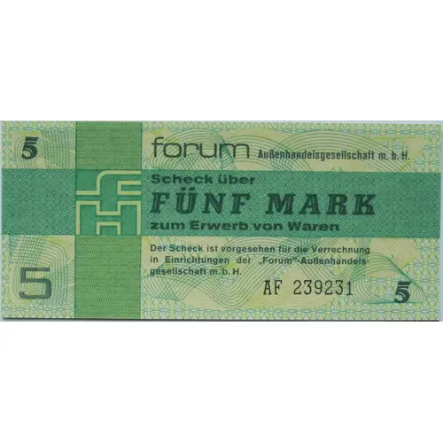 | Obverse lettering | 5 forum Außenhandelsgesellschaft m. b. H. Scheck über FÜNF MARK zum Erwerb von Waren Der Scheck ist vorgesehen für die Verrechnung in Einrichtungen der `Forum`-Außenhandels- gesellschaft m. b. H. 5 AF 239231 5 (Translation: forum Foreign trade company Ltd. Cheque for five marks for the purchase of goods This cheque is intended for payment in facilities of `forum`-Foreign trade company Ltd.) |