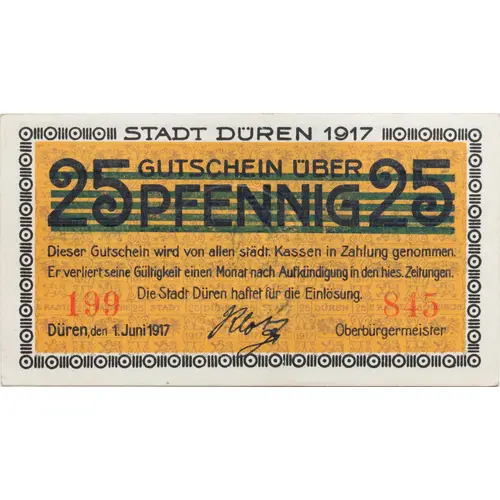 STADT DÜREN 1917 GUTSCHEIN ÜBER 25 PFENNIG 25 (Strikethrough) Dieser Gutschein wird ovn allen städt. Kassen in Zahlung genommen. Er verliert sein Gültigkeit einen Monat nach Aufkündigung in den hies. Zeitungen. Die Stadt Düren haftet für die Einlösung. 3 digigt number (on the left) and on the right side. Düren, den 1. Juni 1917 |