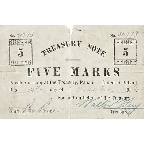 Opis líce 5 TREASURY NOTE 5 FIVE MARKS Payable in coins at the Treasury, Rabaul. Dated at Rabaul this 14th day of October 1914 For and on behalf of the Treasury