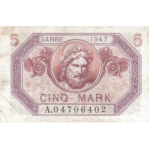5 | 5 SAAR 1947 FÜNF MARK LE CONTREFACTEUR SERA PUNI DES PEINES PREVUES PAR LA LOI. DER NACHDRUCK WIRD MIT DEN DURCH DAS GESETZ VERFUGTEN STRAFEN BESTRAFT. |