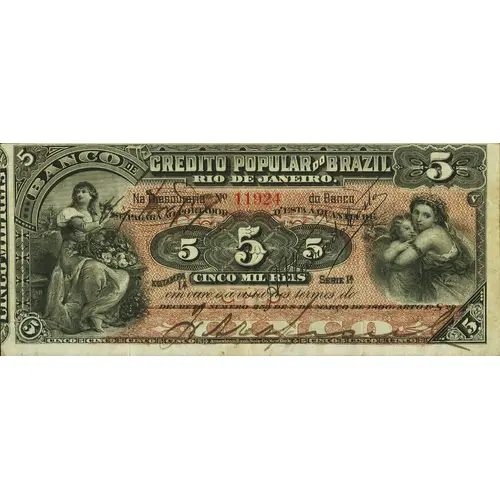 | Obverse lettering | BANCO DE CRÉDITO POPULAR DO BRAZIL RIO DE JANEIRO NA THESOURARIA DO BANCO SE PAGARÁ AO PORTADOR D`ESTA A QUANTIA DE 5 5 5 CINCO MIL REIS EM OURO E À VISTA NOS TERMOS DO DECRETO NÚMERO 253 DE 8 DE MARÇO DE 1890, ART 1º & 2º AMERICAN BANK NOTE CO., NEW YORK (Translation: Popular Credit Bank of Brazil Rio de Janeiro In the bank`s treasury the amount will be paid Five Thousand Reis in gold and in sight in accordance with the Decree number 253 of March 8, 1890, Art 1 and 2 American Bank Note Co., New York) |