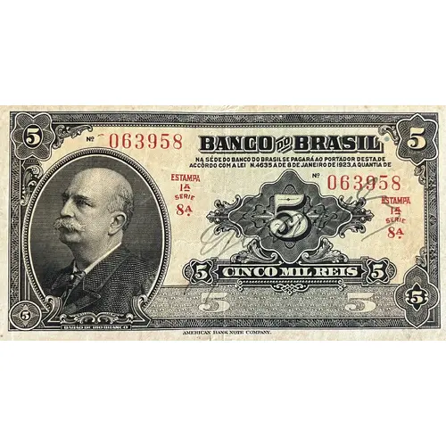 | Obverse lettering | 5 5 BANCO DO BRASIL NA SEDE DO BANCO DO BRASIL, SE PAGARÁ AO PORTADOR DESTA, DE ACCORDO COM A LEI N. 4635 DE 5 DE JANEIRO DE 1923, A QUANTIA DE 5 CINCO MIL REIS 5 BARÃO DO RIO BRANCO AMERICAN BANK NOTE COMPANY (Translation: Bank of Brazil at Banco do Brasil`s Headquarters, it will be paid to the bearer of according to law no. 4635 of January 5, 1923, the amount of 5 Five Thousand Réis 5 Baron of Rio Branco American Bank Note Company) |