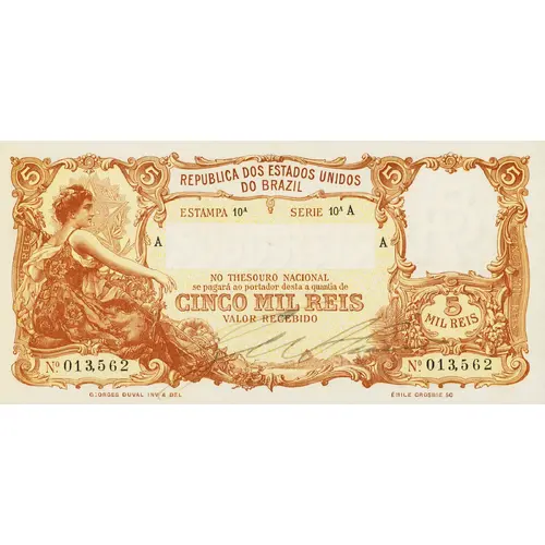 | Obverse lettering | 5 5 5 5 REPÚBLICA DOS ESTADOS UNIDOS DO BRAZIL NO THESOURO NACIONAL SE PAGARÁ AO PORTADOR DESTA A QUANTIA DE CINCO MIL RÉIS VALOR RECEBIDO 5 MIL RÉIS GEORGES DUVAL INV. et DEL. ÉMILE CROSBIE SC. (Translation: Republic of United States of Brazil At the National Treasury the holder will be paid the amount of Five Thousand Réis Amount received Georges Duval Inv. et Del. / Émile Crosbie Sc.) |