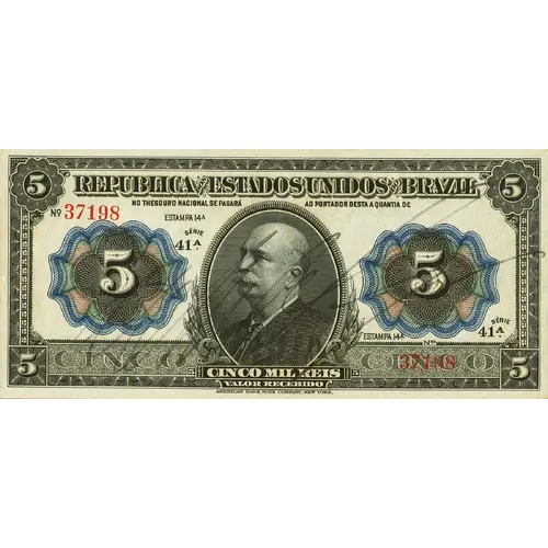| Obverse lettering | 5 5 REPUPLICA DOS ESTADOS UNIDOS DO BRAZIL NO THESOURO NACIONAL SE PAGARÁ AO PORTADOR DESTA A QUANTIA DE 5 5 5 CINCO CINCO 5 CINCO MIL REIS VALOR RECEBIDO AMERICAN BANK NOTE COMPANY, NEW YORK. (Translation: Republic of the United States of Brazil In the National Treasury will be paid to the holder of this amount of 5 Five Five 5 Five Thousand Réis Received Amount American Bank Note Company, New York.) |
