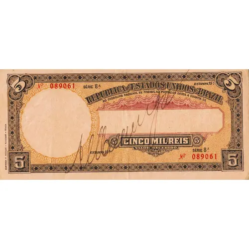 | Obverse lettering | 5 5 REPÚBLICA DOS ESTADOS UNIDOS DO BRAZIL NO THESOURO NACIONAL SE PAGARÁ AO PORTADOR DESTA A QUANTIA DE 5 CINCO MIL RÉIS 5 VALOR RECEBIDO 5 5 CARTIERI P. MILIANI - FABRIANO - ITÁLIA (Translation: Republic of the United States of Brazil In the National Treasury will be paid to the holder of this amount of Five Thousand Réis Received Amount Cartieri P. Miliani - Fabriano - Italy) |