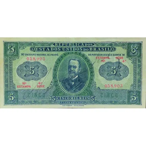 | Obverse lettering | 5 5 REPÚBLICA DOS ESTADOS UNIDOS DO BRASIL NO THESOURO NACIONAL SE PAGARÁ AO PORTADOR DESTA A QUANTIA DE 5 5 CINCO MIL RÉIS VALOR RECEBIDO 5 5 CASA DA MOEDA - RIO DE JANEIRO (Translation: Republic of the United States of Brazil In the National Treasure will be paid to the carrier of this amount of Five Thousand Réis Amount Received Casa da Moeda - Rio de Janeiro) |