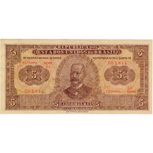 | Obverse lettering | 5 5 REPÚBLICA DOS ESTADOS UNIDOS DO BRASIL NO THESOURO NACIONAL SE PAGARÁ AO PORTADOR DESTA A QUANTIA DE 5 5 CINCO MIL RÉIS VALOR RECEBIDO 5 5 CASA DA MOEDA - RIO DE JANEIRO (Translation: Republic of the United States of Brazil In the National Treasure will be paid to the carrier of this amount of Five Thousand Réis Amount Received Casa da Moeda - Rio de Janeiro) |