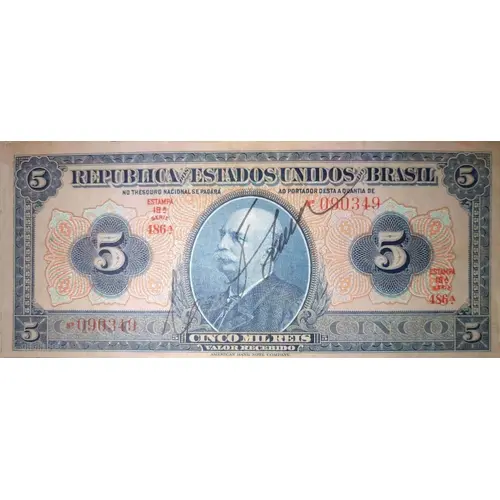 | Legenda awersu | 5 5 REPUBLICA DOS ESTADOS UNIDOS DO BRASIL NO THESOURO NACIONAL SE PAGARÁ AO PORTADOR DESTA A QUANTIA DE 5 5 CINCO 5 CINCO MIL REIS 5 CINCO VALOR RECEBIDO 5 5 AMERICAN BANK NOTE COMPANY. (Translation: Republic of the United States of Brazil In the National Treasury will be paid to the holder of this amount of Five Five Thousand Réis Five Amount Received American Bank Note Company.) |