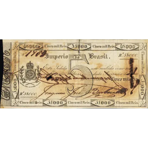 5 5$000 Cinco mil Reis 5$000. Cinco mil Reis 5$000 5 5$000. Cinco mil Reis. Cinco mil Reis. 5$000. N. ___ Rs.5$000. Imperio do Brasil. Esta cedula será recebida como moeda nas Estações Publicas desta Provincia d__ _____________ no valor de Cinco mil reis. 5 Rs. 5$000. 5 Cinco mil Reis. 5$000. Cinco mil Reis. 5$000. Cinco mil Reis (Translation: 5$000. Five Thousand Réis Empire of Brazil This ballot will be received as currency at the Public Stations of this _____ Province in the amount of Five Thousand Réis.) |