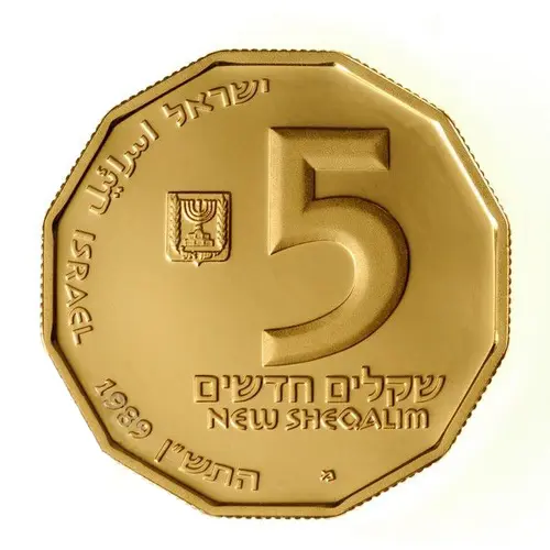 | Descripción del anverso | Face value in Hebrew and English, 1/2 New Sheqel on the Silver B.U. coin, 1 New Sheqel on the Silver Proof Coin, 5 New Sheqalim on the Gold Coin, the Israel State Emblem to the left of the face value, the word `ISRAEL` in the upper left-hand border in Hebrew, Arabic and English, the mint year 1989 / 5750 in the lower left-hand border. |