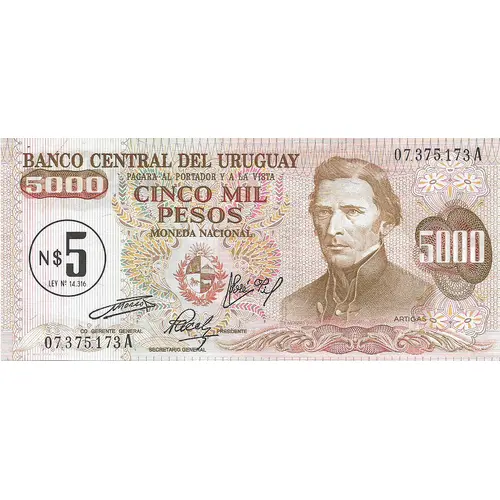 | Obverse lettering | BANCO CENTRAL DEL URUGUAY CINCO MIL PESOS (Translation: Central Bank of Uruguay Five thousand Pesos) |