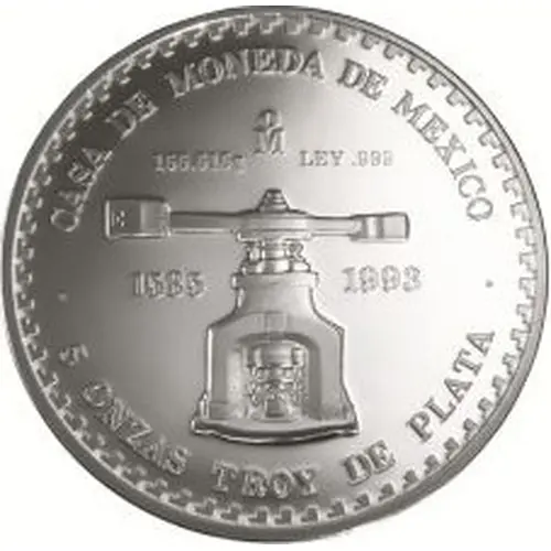 | Obverse lettering | CASA DE MONEDA DE MEXICO 155.515g Mo LEY .999 1535 1993 5 ONZAS TROY DE PLATA |