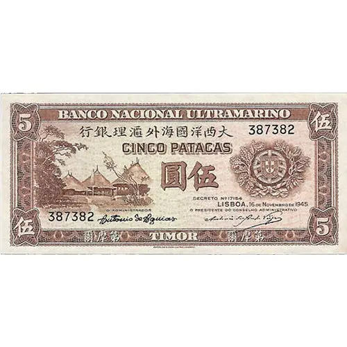 | Obverse lettering | BANCO NACIONAL ULTRAMARINO CINCO PATACAS TIMOR Lisboa 16 de Novembro de 1945 |