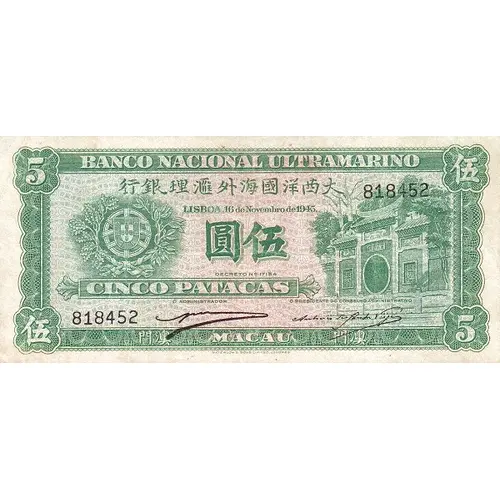| Obverse lettering | BANCO NACIONAL ULTRAMARINO 行銀理滙外海國洋西大 LISBOA, 16 de Novembro de 1945. 圓伍 DECRETO № 17154 CINCO PATACAS O ADMINISTRADOR | O PRESIDENTE DE CONSELHO ADMINISTRATIVO 門澳 MACAU 門澳 |