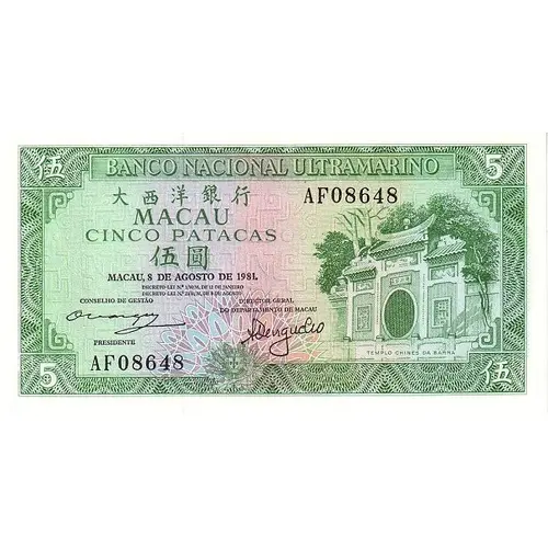 | Obverse lettering | BANCO NACIONAL ULTRAMARINO 大西洋銀行 MACAU CINCO PATACAS 伍圓 MACAU, 8 DE AGOSTO DE 1981. DIRECTO–LEI № 1/80/M, DE 12 DE JANEIRO DIRECTO–LEI № 23/81/M, DE 8 DE AGUSTO CONSELHO DE GESTÃO / DIRECTOR GERAL DO DEPARTAMENTO DE MACAU PRESIDENTE TEMPLO CHINES DA BARRA (Translation: National Overseas Bank Macau Five Patacas) |