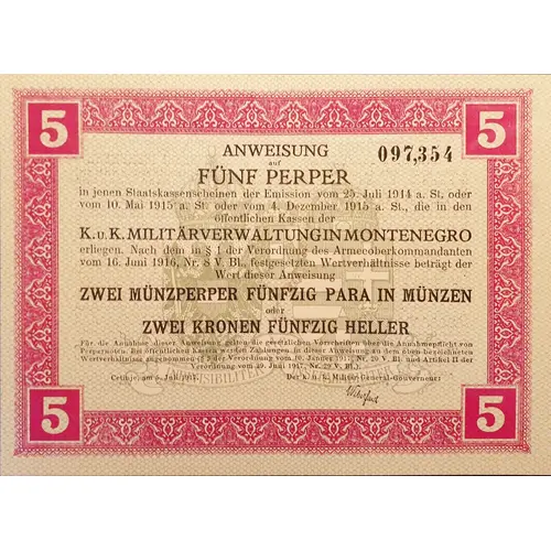 UPUTNICA NA PET PERPERA u onim uputnicama na državnu blagajnu iz emisije od 25. jula 1914. st. kal. ili 10. maja 1915. st. kal. ili 4. decembra 1915 st. kal., koje leže u javnim blagajnama c. i kr. Vojne Uprave u Crnoj Gori. Po vrijednosnom razmjeru utvrđenom u 1. Naredbe Vrhovnog Vojnog Zapovjednika od 16. juna 1916, broj 8 Vjestnika Naredaba, iznaša vrijednost ove uputnice DVA ZVEČEĆA PERPERA I PEDESET ZVEČEĆIH PARA ILI DVIJE KRUNE I PEDESET HELERA. Za primanje ove uputnice važe zakonske odredbe o dužnosti primanja perperskih uputnica. Na javnim blagajnama primat će se uplate sa ovom uputnicom po gore označenom vrijednosnom raz- mjeru (3. Naredbe od 10.januara 1917., broj 20 Vjestnika Naredaba i članka II. Naredbe od 29. juna 1917, broj 29 Vjestnika Naredaba). Cetinje, 5. jula 1917. C. i kr. voj. generalni guverner (signature) |