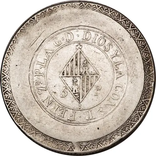 FERN 7º P·LA G·D·DIOS Y LA CONST· (Translation: Ferdinand VII by the grace of God and the Constitution) |