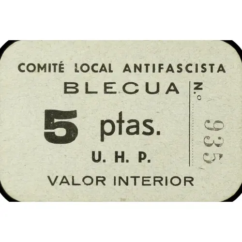 COMITÉ LOCAL ANTIFASCISTA BLECUA 5 ptas. U. H. P. VALOR INTERIOR (Translation: Local Anti-Fascist Committee Blecua 5 Pesetas Inner value) |
