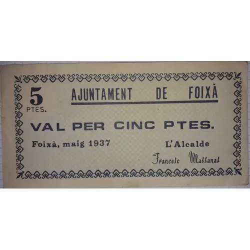 5 PTES. AJUNTAMENT DE FOIXÀ VAL PER CINC PTES. Foixà, maig 1937 L`Alcalde (Francesc Massanas) (Translation: City Council of Foixà Value for Five Pesetas Foixà, May 1937 The Mayor (Francesc Massanas)) |