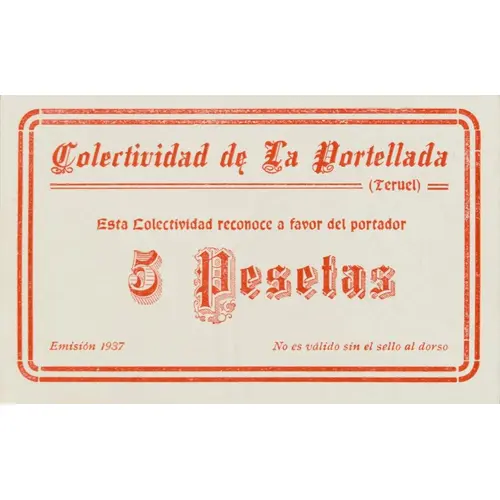 | Obverse lettering | Colectividad de La Portellada (Teruel) Esta Colectividad reconoce a favor del portador 5 Pesetas Emisión 1937 No es válido sin el sello al dorso (Translation: Collectivity of La Portellada (Teruel) This Collectivity recognizes in favor of the bearer 5 Pesetas Issue 1937 Not valid without the stamp on the back) |