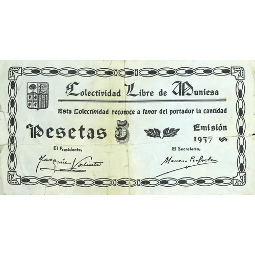 Colectividad Libre de Muniesa Esta Colectividad reconoce a favor del portador la cantidad de Pesetas 5 Emisión 1937 (Translation: Free Collectivity of Muniesa This Collectivity recognizes in favor of the bearer the amount of Pesetas 5 Issue 1937) |