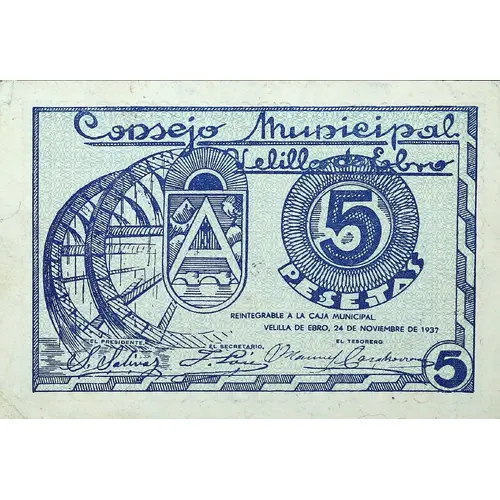 Consejo Municipal Velilla de Ebro 5 PESETAS REINTEGRABLE A LA CAJA MUNICIPAL VELILLA DE EBRO, 24 DE NOVIEMBRE DE 1937 (Translation: Municipal Council of Velilla de Ebro 5 Pesetas Reintegrable to the Municipal Fund Velilla de Ebro, November 24, 1937) |