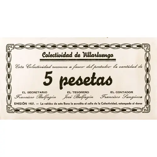 Colectividad de Villarluengo Esta Colectividad reconoce a favor del portador la cantidad de 5 pesetas EMISIÓN 1937.- La validez de este Bono la acredita el sello de esta Colectividad, estampado al dorso (Translation: Collectivity of Villarluengo This Collectivity recognizes in favor of the bearer the amount of 5 Pesetas Issue 1937. The validity of this Bond is accredited by the stamp of this Collectivity stamped at back) |