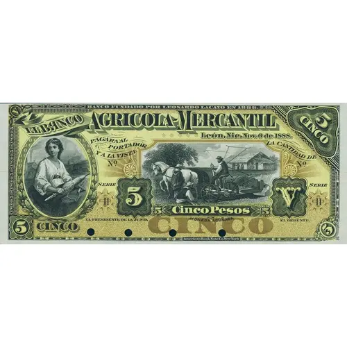 BANCO FUNDADO POR LEONARDO LACAYO EM 1888 EL BANCO AGRICOLA MERCANTIL Pagará al portador y a la vista la cantidad de 5 CINCO PESOS V EN MOEDA ACUÑADA León, Nic. Nov. 6 de 1888. American Bank Note Co., New York (Translation: Bank founded bt Leonardo Lacayo in 1888 The Mercantile Agricultural Bank It will pay to the bearer and on sight the amount of Five Pesos in minted currency León, Nic. November 6, 1888. American Bank Note Co., New York) |
