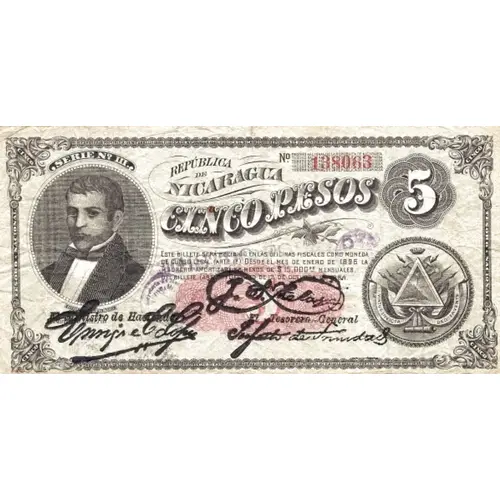 Obverse lettering REPÚBLICA DE NICARAGUA SERIE Nº III CINCO PESOS ESTE BILLETE será recibido en las oficinas Fiscales como moneda de Curso Legal (Art.1º) Desde el mês de ENERO de 1896. La Tesoreria amortizara no ménos de $15.000ºº MENSUALES DE BILLETES (Art.7º) Decreto de 12 de Octubre de 1894.