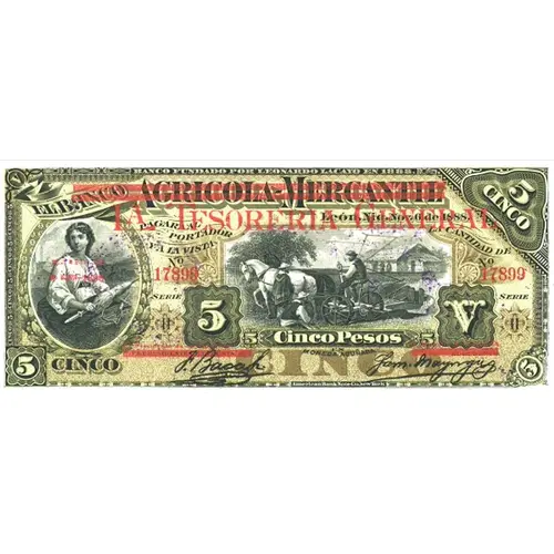 Banco 5 Agricola-Mercantil American Bank Note Company, New York (Translation: Mercantile Agricultural Bank 5 American Bank Note Company, New York) |
