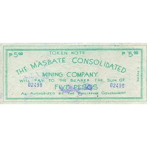 TOKEN NOTE THE MASBATE CONSOLIDATED MINING COMPANY WILL PAY TO THE BEARER THE SUM OF FIVE PESOS AS AUTHORIZED BY THE PHILIPPINE GOVERNMENT |