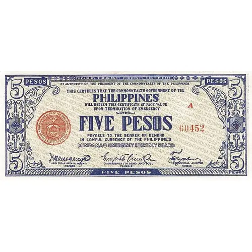 TREASURY EMERGENCY CURRENCY CERTIFICATE BY AUTHORITY OF TH PRESIDENT OF THE COMMONWEALTH OF THE PHILIPPINES THIS CERTIFIES THAT THE COMMONWEALTH GOVERNMENT OF THE PHILIPPINES WILL REDEEM THIS CERTIFICATE AT FACE VALUE UPON TERMINATION OF EMERGENCY FIVE PESOS PAYABLE TO THE BEARER ON DEMAND IN LAWFUL CURRENCY OF THE PHILIPPINES MINDANAO EMERGENCY CURRENCY BOARD |