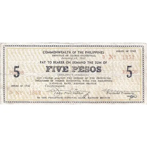 | Obverse lettering | COMMONWEALTH OF THE PHILIPPINES PROVINCE OF NEGROS OCCIDENTAL JANUARY 13, 1942 PAY TO BEARER ON DEMAND THE SUM OF FIVE PESOS (PHILIPPINE CURRENCY) AND CHANGE AGAINST THE DEPOSIT OF PROVINCIAL TREASURER OF NEGROS OCCIDENTAL WITH THE PHILIPPINE NATIONAL BANK, BACOLOD BRANCH TO THE PHILIPPINE NATIONAL BANK, BACOLOD BRANCH |