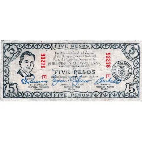 FIVE PESOS THE MISAMIS OCCIDENTAL AGENCY OF THE PHILIPPINE NATIONAL BANK WILL PAY TO THE BEARER ON DEMAND THE AMOUNT OF THIS PHILIPPINE NATIONAL BANK EMERGENCY CIRCULATING NOTE FIVE PESOS ISSUED BY THE MISSAMIS OCCIDENTAL CURRENCY COMMITTEE FIVE PESOS |