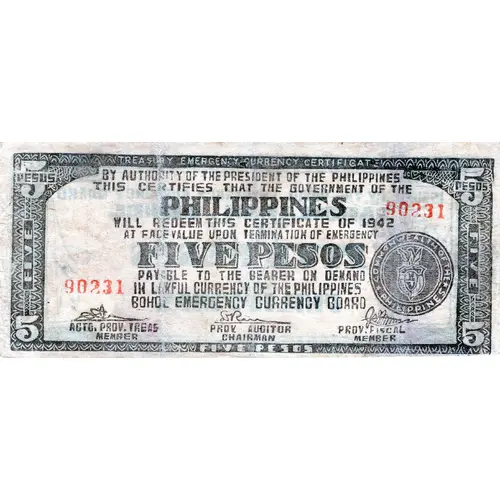 | 表面の銘文 | TREASURY EMERGENCY CERTIFICATE BY AUTHORITY OF THE PRESIDENT OF THE PHILIPPINES WILL REDEEEM THIS CERTIFICATE AT FACE VALUE UPON TERMINATION OF EMERGENCY FIVE PESOS PAYABLE TO THE BEARER ON DEMAND IN LAWFULL CURRENCY OF THE PHILIPPINES BOHOL EMERGENCY CURRENCY BOARD FIVE PESOS |