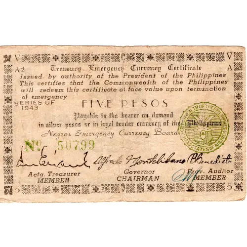 | Obverse lettering | TREASURY EMERGENCY CURRENCY CERTIFICATE ISSUED BY AUTHORITY OF THE PRESIDENT OF THE PHILIPPINES THIS CERTIFIES THAT THE COMMONWEALTH OF THE PHILIPPINES WILL REDEEM THIS CERTIFICATE AT FACE VALUE UPON TERMINATION OF EMERGENCY FIVE PESOS PAYABLE TO THE BEARER ON DEMAND IN SILVER PESOS OR IN LEGAL TENDER CURRENCY OF THE PHILIPPINES NEGROS EMERGENCY CURRENCY BOARD |