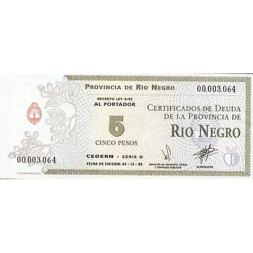 | Legenda do anverso | PROVINCIA DE RIO NEGRO DECRETO 9/95 AL PORTADOR CERTIFICADOS DE DEUDA DE LA PROVINCIA DE RIO NEGRO 5 CINCO PESOS CEDERN - SERIE A FECHA DE EMISION: 04 - 12 - 95 (Translation: PROVINCE OF RIO NEGRO DECREE 9/95 TO THE CARRIER DEBT CERTIFICATES OF THE PROVINCE OF RIO NEGRO 5 FIVE PESOS CEDERN - SERIES A ISSUE DATE: 04 - 12 - 95) |