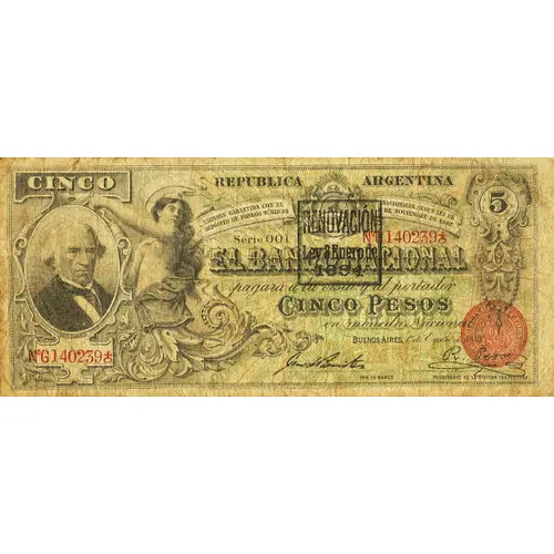 | Obverse lettering | REPUBLICA ARGENTINA Emisión garantida con el depósito de fondos públicos nacionales, según Ley de 3 de Noviembre de 1887. EL BANCO NACIONAL pagará á la vista y al portador CINCO PESOS en moneda nacional BUENOS AIRES, 1º de Enero de 1888. BRADBURY, WILKINSON Y CIA, GRABADORES LONDRES Overprinted: `RENOVACIÓN - Ley 8 Enero de 1894` (Translation: Republic Argentina Emission guaranteed with the deposit of national public funds, according to the Law of November 3, 1887. The National Bank will pay at sight and to the bearer Five Pesos in national currency Buenos Aires, January 1, 1888. Bradbury, Wilkinson and Co, London Engravers Overprinted: `Revalued - Law January 8, 1894`) |