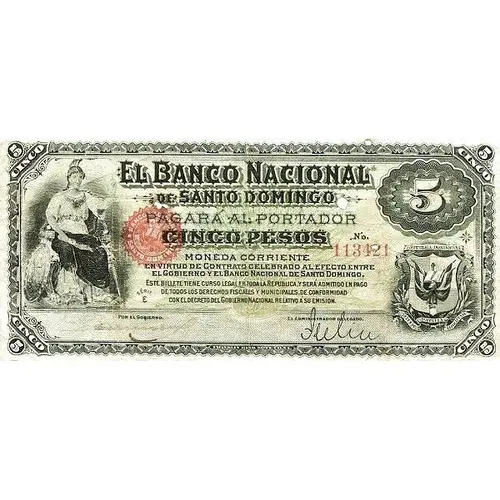 | Obverse lettering | El Banco Nacional de Santo Domingo PAGARÁ AL PORTADOR CINCO PESOS MONEDA CORRIENTE en virtud de Contrato celebrado al efecto entre el Gobierno y el Banco Nacional de Santo Domingo. Este billete tiene curso legal en toda la Republica , y será admitido en pago de todos los derechos fiscales y municipales, de conformidad con el decreto del Gobierno Nacional relativo á su emision. (Translation: The National Bank of Santo Domingo will pay to the bearer five Pesos common currency by virtue to contract issued between the Govenment and the National Bank of Santo Domingo. This note is legal tender on all the Republic, and will be accepted for payment of all fiscal and municipal debts, accordingly to the related National Government decree.) |