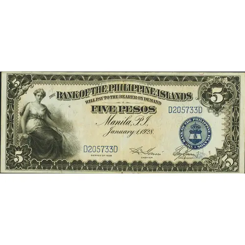 | Obverse lettering | THE BANK OF THE PHILIPPINE ISLANDS WILL PAY TO THE BEARER ON DEMAND FIVE PESOS MANILA |