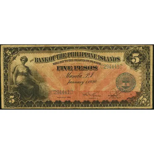 | Obverse lettering | THE BANK OF THE PHILIPPINE ISLANDS WILL PAY TO THE BEARER ON DEMAND FIVE PESOS MANILA |