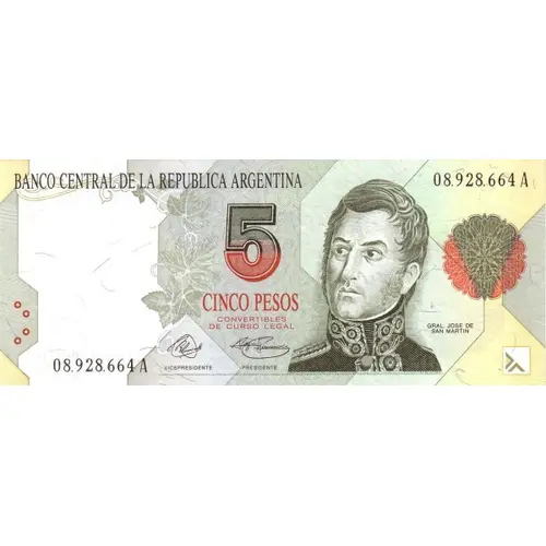 | Obverse lettering | BANCO CENTRAL DE LA REPUBLICA ARGENTINA CINCO PESOS CONVERTIBLES DE CURSO LEGAL (Translation: Central Bank of the Argentine Republic Five Pesos Convertable of Legal Tender) |