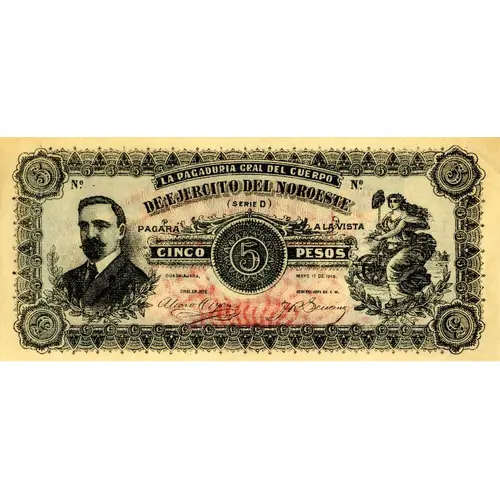 Obverse lettering La Pagaduría Gral del cuerpo de Ejercito del Noroeste pagará a la vista 5 pesos