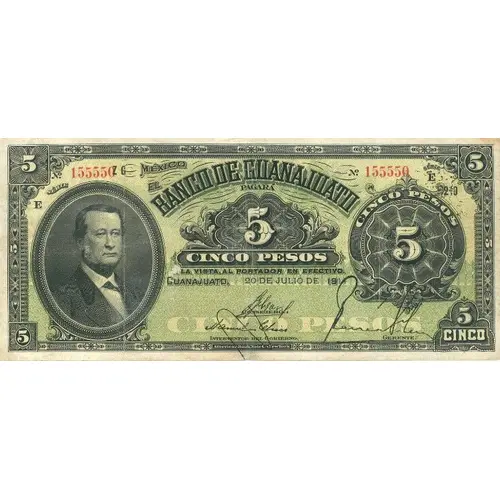 | Obverse lettering | El Banco de Guanajuato pagará a la vista al portador en efectivo Cinco Pesos (Translation: The Bank of Guanajuato will pay the bearer with cash Five Pesos) |