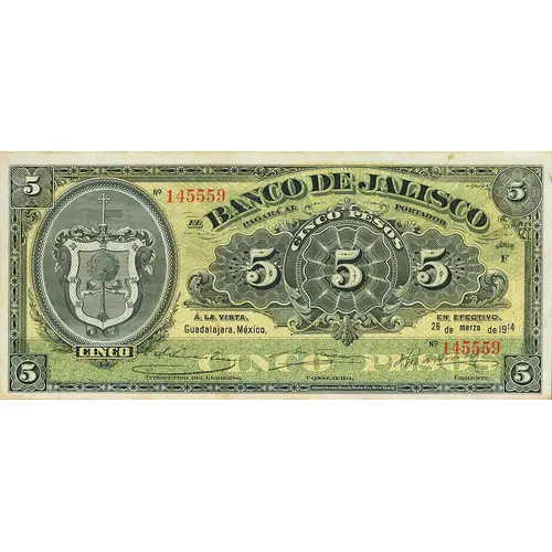 | Obverse lettering | EL BANCO DE JALISCO PAGARA AL PORTADOR CINCO PESOS A LA VISTA EN EFECTIVO Guadalajara, México, 26 de marzo de 1914 (Translation: The Bank of Jalisco will pay the bearer Five Pesos on sight in cash Guadalajara, Mexico 26 March 1914) |