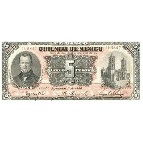| Obverse lettering | EL BANCO ORIENTAL DE MEXICO pagara al portador en esta ciudad á la vista Cinco Pesos EN EFECTIVO Puebla, Septiembre 1º de 1909 (Translation: The Eastern Bank of Mexico will pay to the bearer in this city on sight Five Pesos in cash. Puebla, September 1st 1909) |