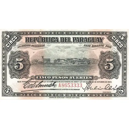 | Obverse lettering | REPÚBLICA DEL PARAGUAY LA NACION RECONOCE ESTE BILLETE POR 5 CINCO PESOS FUERTES QUE PAGARÁ CONFORME Á LA LEY Nº 463 DE 30 DE DECIEMBRE DE 1920 Y LEY Nº 550 DE 25 DE OCTUBRE DE 1923. POR EL BANCO DE LA REPUBLICA DEL PARAGUAY (Translation: Republic of Paraguay The Nation recognizes this note for Five Pesos Fuertes That will pay according to the Law no.463 of December 30th., 1920 and no.550 of October 25th., 1923. By Bank of Republic of Paraguay) |